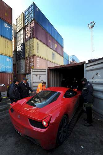 Italian officials seize stolen sports cars at port of Naples Custom officials surround a stolen Ferrari 458 at the port of Naples after being found in a shipping container. Two containers, one with the Ferrari 458 and a Ferrari 599 inside and one with a Porsche Panamera and Mercedes SLS that had been stolen in Spain inside, were seized by the police in collaboration with customs authorities. The Wall Street Journal Europe